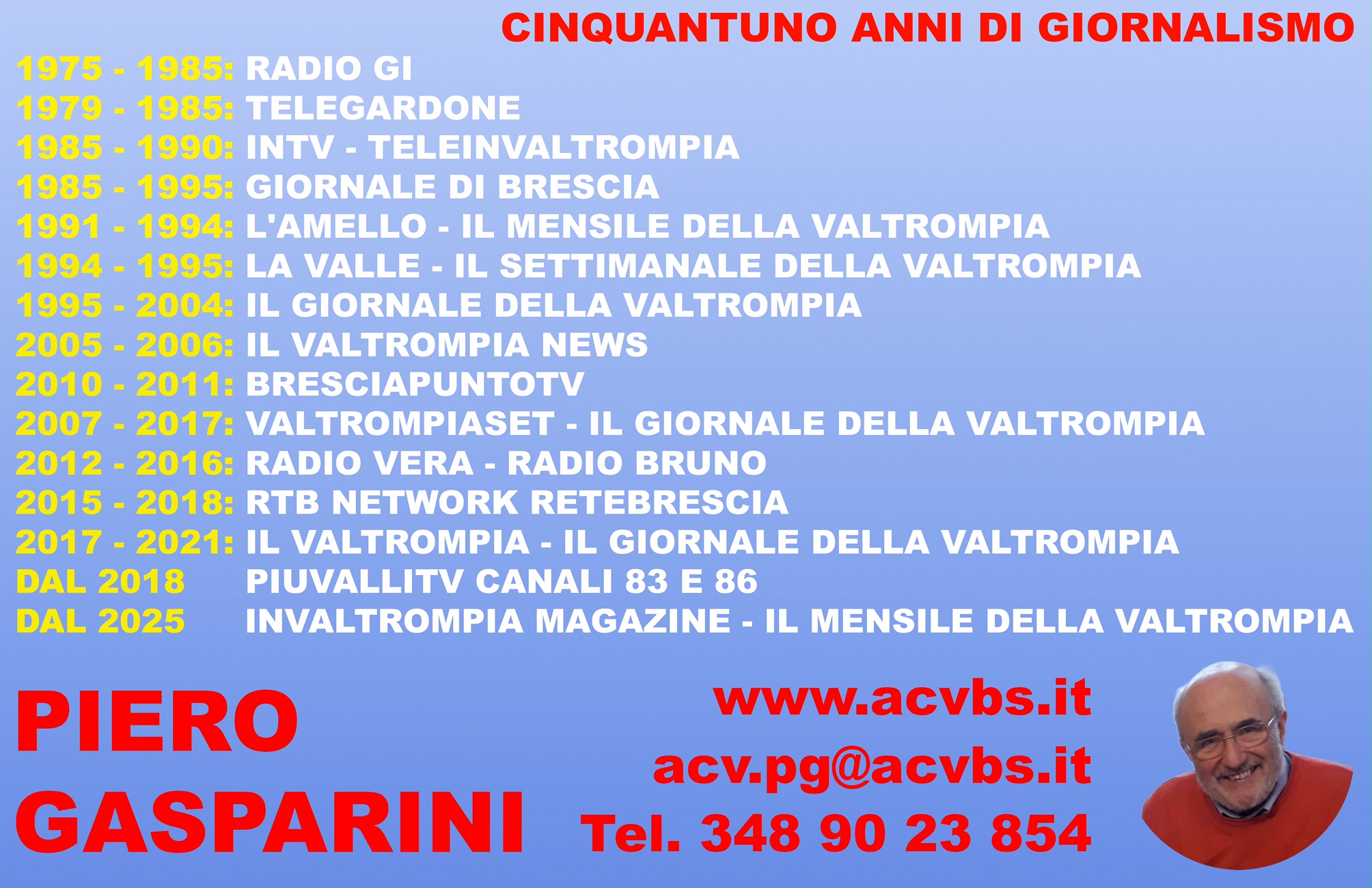 DAL 7 NOVEMBRE 2015 al 31 LUGLIO 2018 CONDUTTORE DELLE TRASMISSIONE SETTIMANALI “LA BELLA VALTROMPIA” - “LA BELLA PROVINCIA DI BRESCIA” SULL’EMITTENTE TELEVISIVA RTB NETWORK RETEBRESCIA CANALE 72