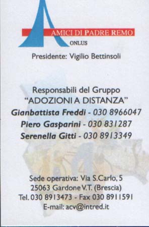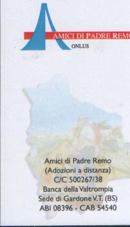 Ci rivolgiamo a tutti Voi, che avete in atto in questo 2006 una “adozione a distanza” per farVi sapere, se ve ne fosse il bisogno, che il prossimo Natale ricorderemo ufficialmente i 20 anni della scomparsa del nostro Don Remo, là in terra di Bolivia dove è sepolto a fianco dell’ingresso della Chiesa nel villaggio di Hardeman.