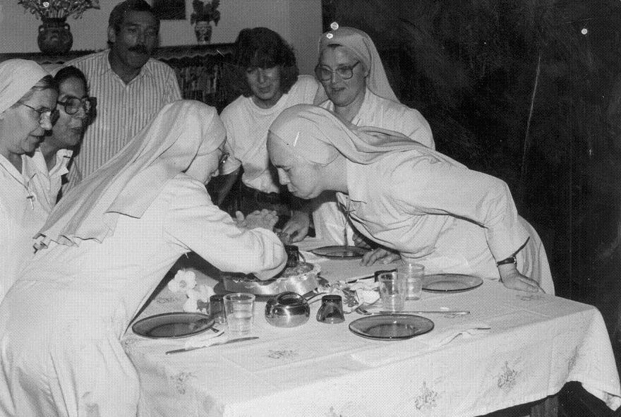 Suor Alessandra (a sx) e Suor Maria Grazia con don Severino Chiari |